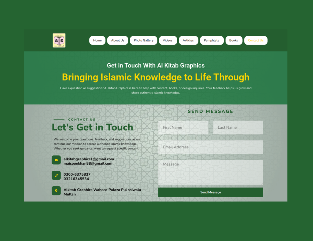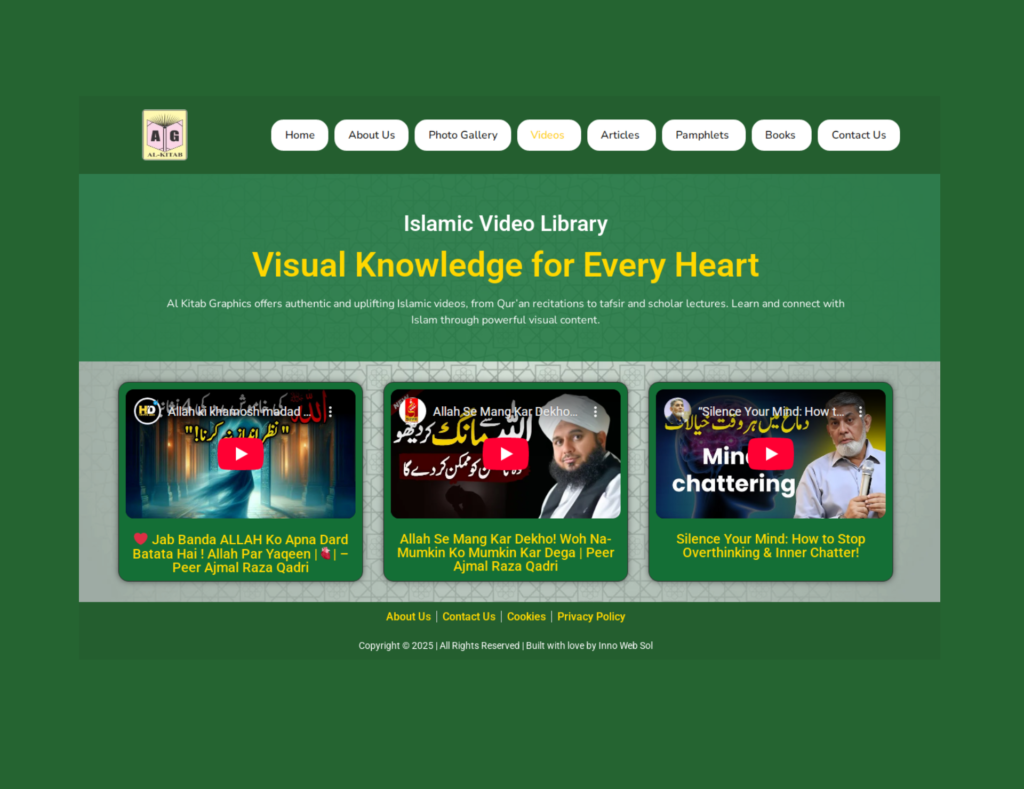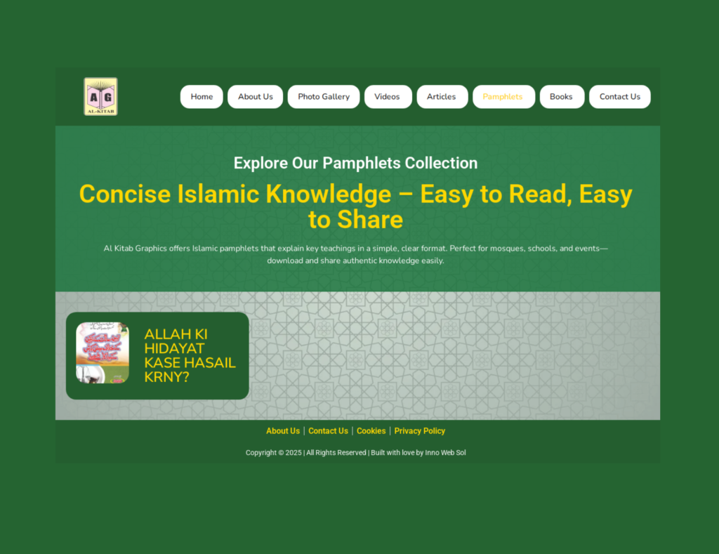 We developed a focused and visually appealing website for Al Kitab Graphics, a platform dedicated to presenting authentic Islamic knowledge through creative design. The site serves as a centralized archive and distribution channel for their diverse media assets—Books, Pamphlets, Articles, and Videos. The project prioritized professional content structuring and high-speed delivery to connect effectively with the heart and mind of the user.
