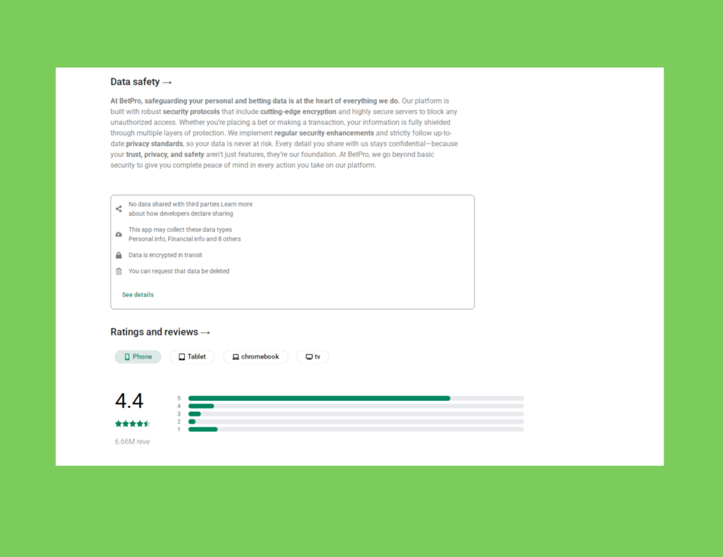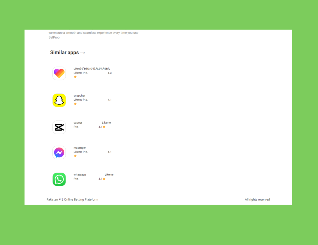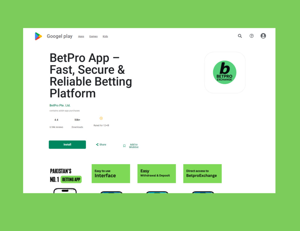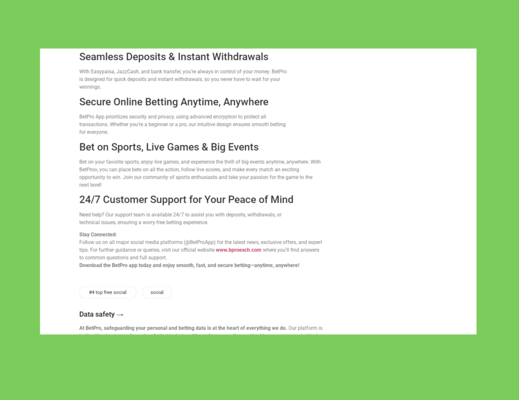 We created a high-trust Google Play store landing page (mimicking the style of a dedicated website) for the BetPro betting app. The design emphasizes security, instant payouts via JazzCash/Easypaisa, and a seamless betting experience. The layout is optimized to drive mobile installs and highlight key features and customer reviews.