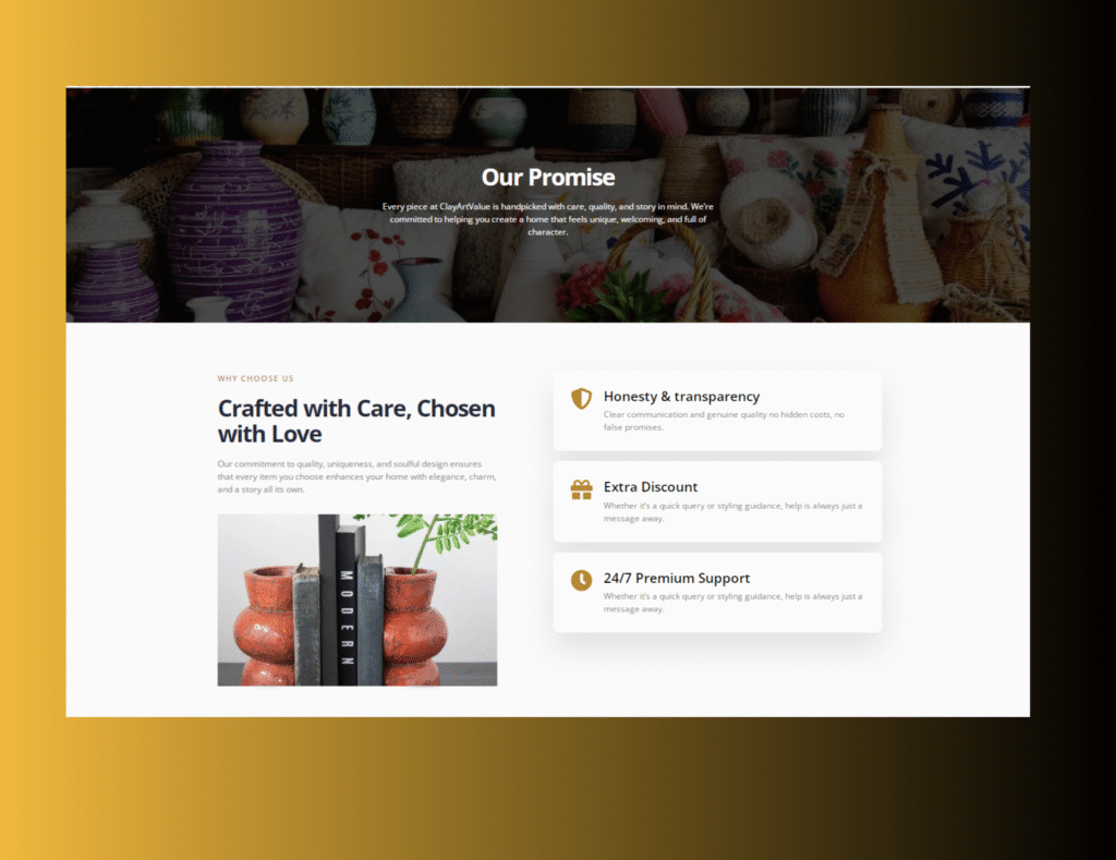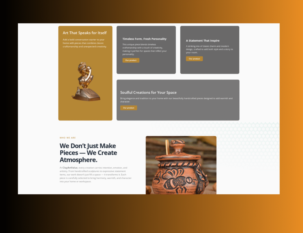 We built a clean, responsive website that beautifully presents Clay Art Value’s handcrafted products. Our focus was on smooth navigation, engaging galleries, and a seamless user experience. The platform helps attract potential buyers while showcasing the brand’s artistic identity. We developed this site by ensuring such functionalities: