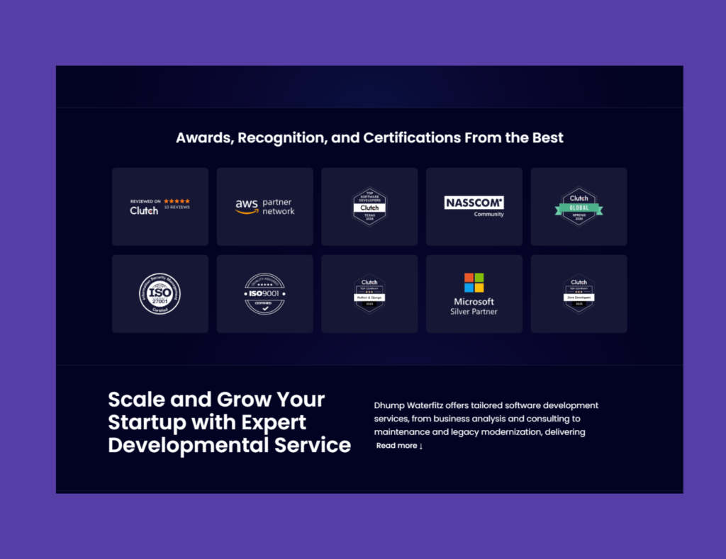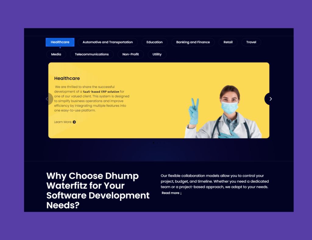 Dhump Waterfitz is an expert software development company specializing in custom solutions for startups, SMBs, and large enterprises across various industries. We designed and developed a professional, high-credibility corporate website focused on clearly communicating their extensive experience, technical expertise, successful track record, and flexible engagement models to a global clientele.