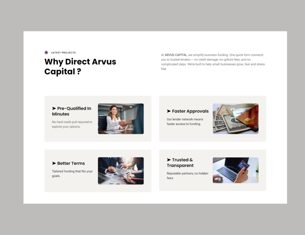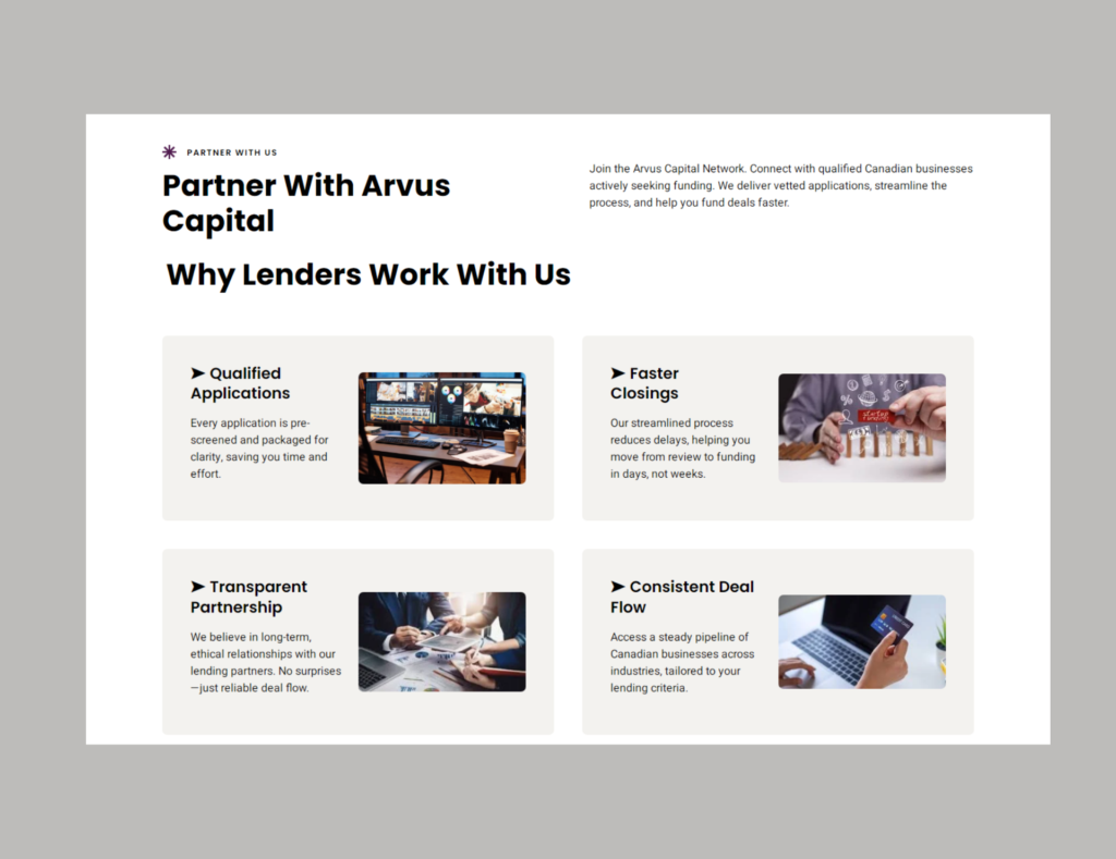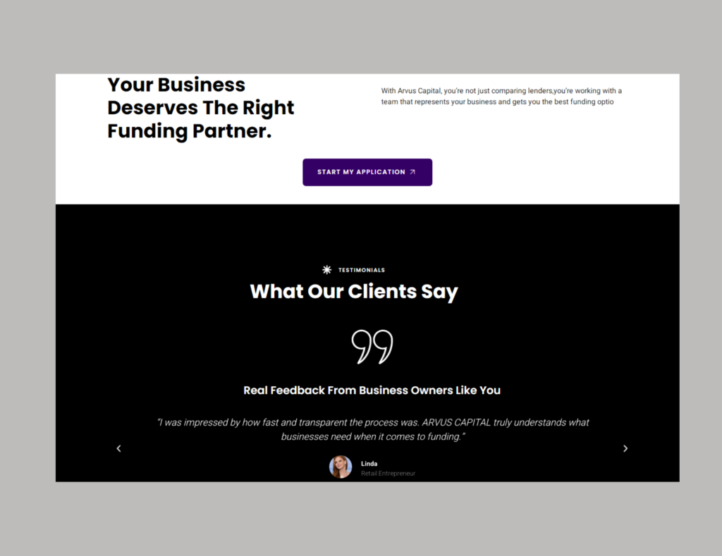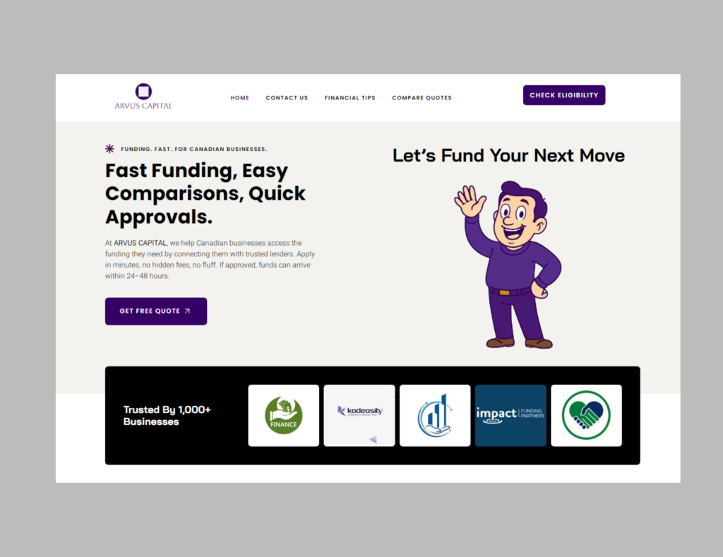 We developed a sophisticated, conversion-optimized platform for ARVUS CAPITAL, specializing in connecting Canadian businesses with fast, vetted funding options. The core design emphasizes speed (“Fund. Fast.”), transparency, and trust, utilizing powerful forms to capture high-quality leads that are pre-qualified for the lending network.
