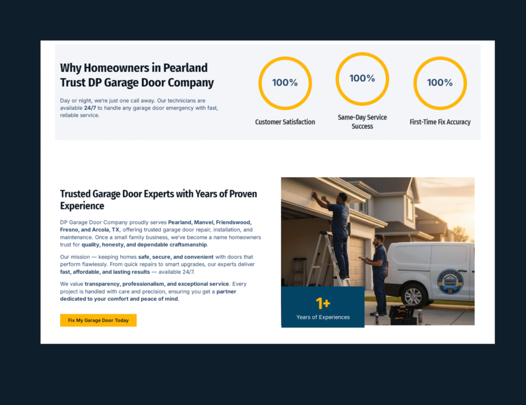 Basically they offers fast, reliable, and professional garage door installation and repair services for residential and commercial clients. This portfolio showcases the modern, high-performance DP GARAGE DOOR EXPERT website built by Inno Web Sols, designed to highlight services, increase customer inquiries, and provide a smooth and user-friendly experience across all devices.