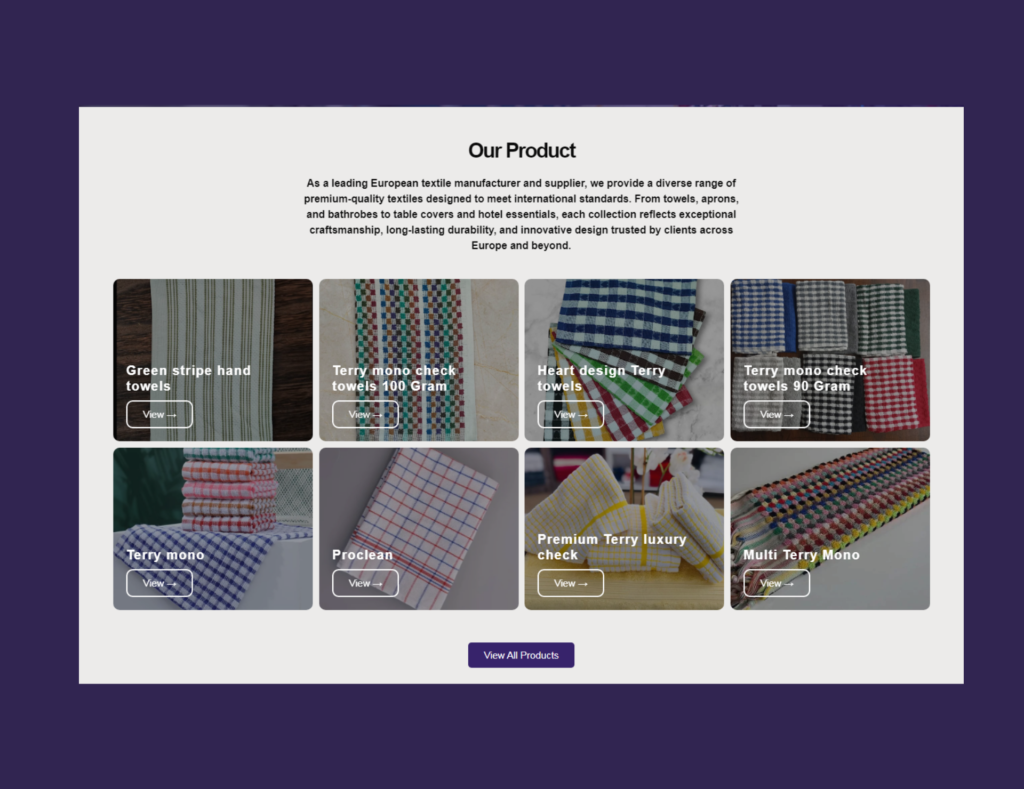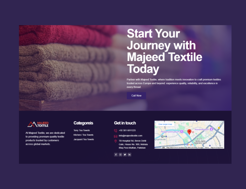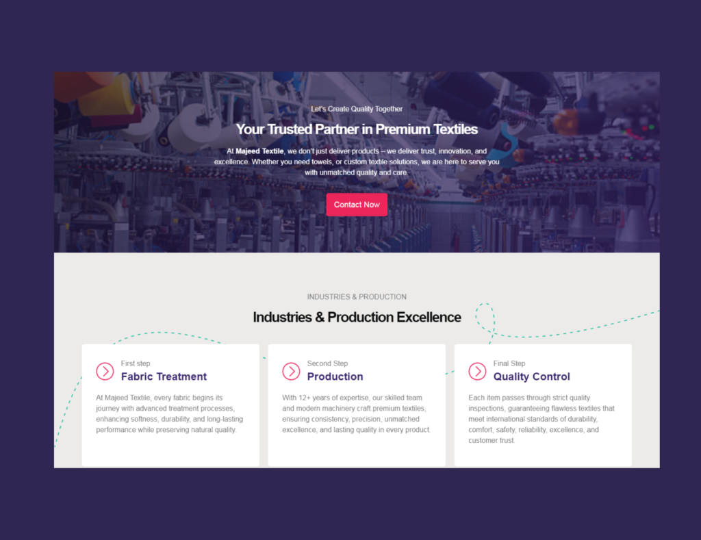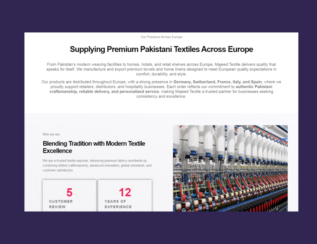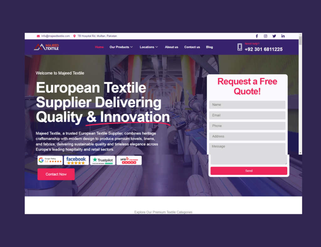 We developed a sophisticated digital identity for Majeed Textile, a European textile supplier. The site features an elegant product catalog, a map showcasing their European presence, and a direct ‘Request a Quote’ system, all optimized for high-speed performance and strong B2B lead generation.