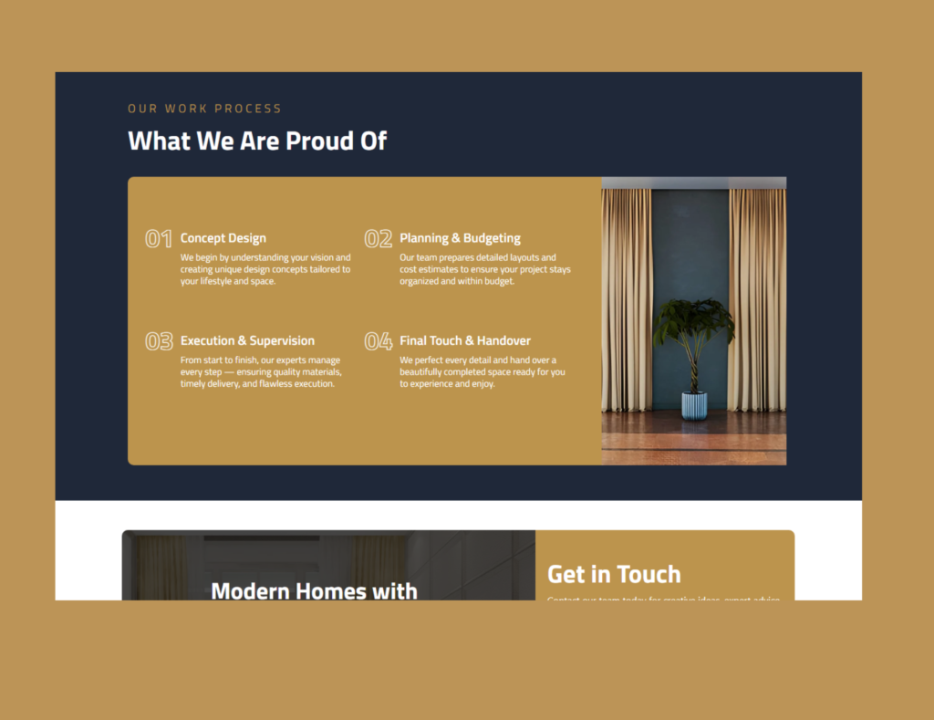 The visual design, constructed using Elementor Pro, focuses on luxury and aesthetics, featuring image galleries for architecture, interior, and exterior designs. The clean, modern aesthetic is crucial for a brand selling premium home elegance.