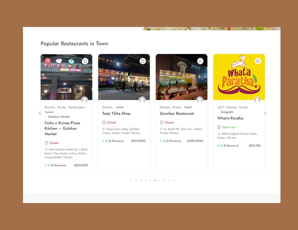 We developed a high-speed, localized dining discovery platform for Multan. The site utilizes the Golo framework for directory functionality and features listings categorized by popular areas. It is heavily optimized with WP Rocket and Rank Math for fast loading and strong local SEO, connecting food lovers with the best eateries.