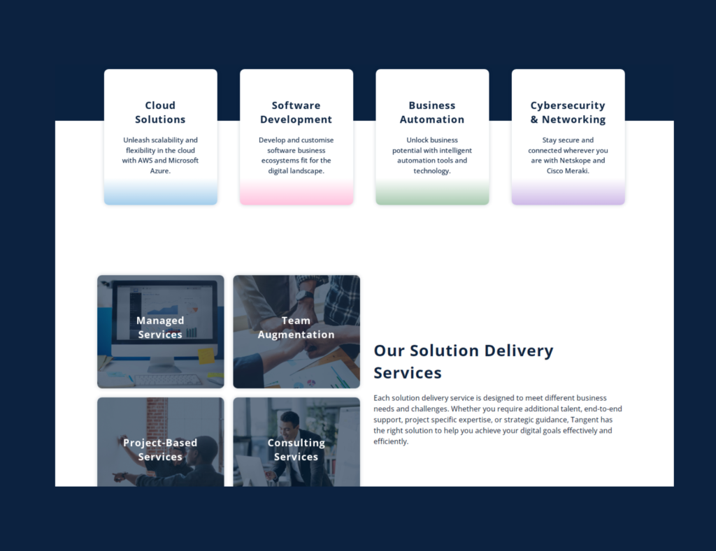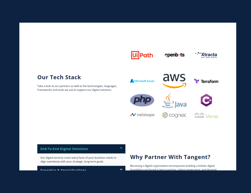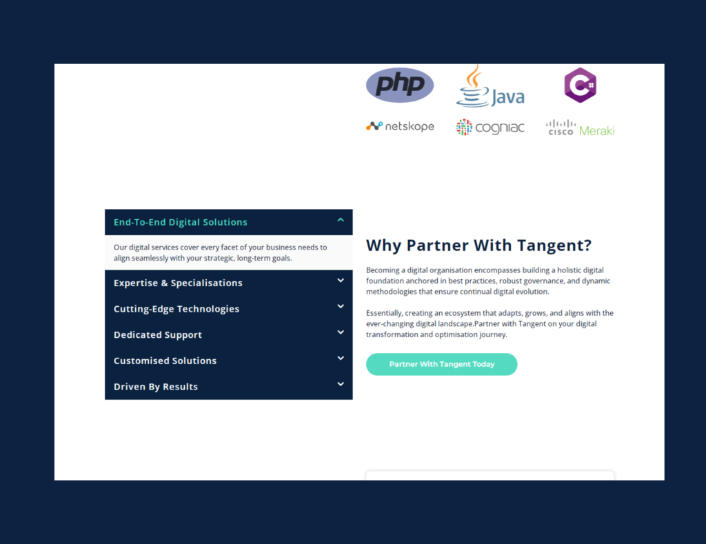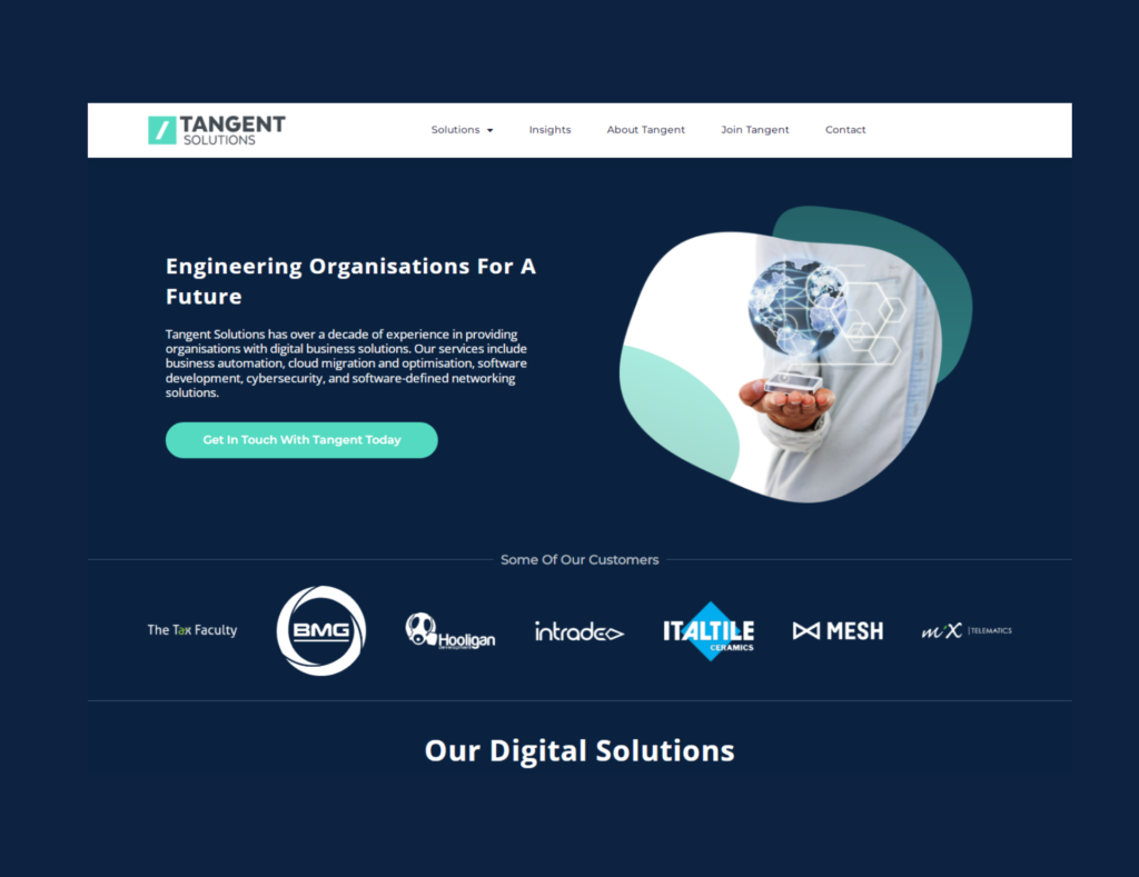 The Tangent Solutions project involved building a highly professional and credible online presence essential for securing large enterprise contracts. We focused on features that convey authority: a clear presentation of their core offerings, a dedicated section detailing their Solution Delivery Services, and a prominent showcase of their technology partners and client testimonials to validate their expertise and successful track record. This project significantly strengthened Tangent’s corporate image and digital authority, providing a robust platform to educate potential enterprise clients and convert strategic interest into high-value B2B engagements across various digital initiatives.