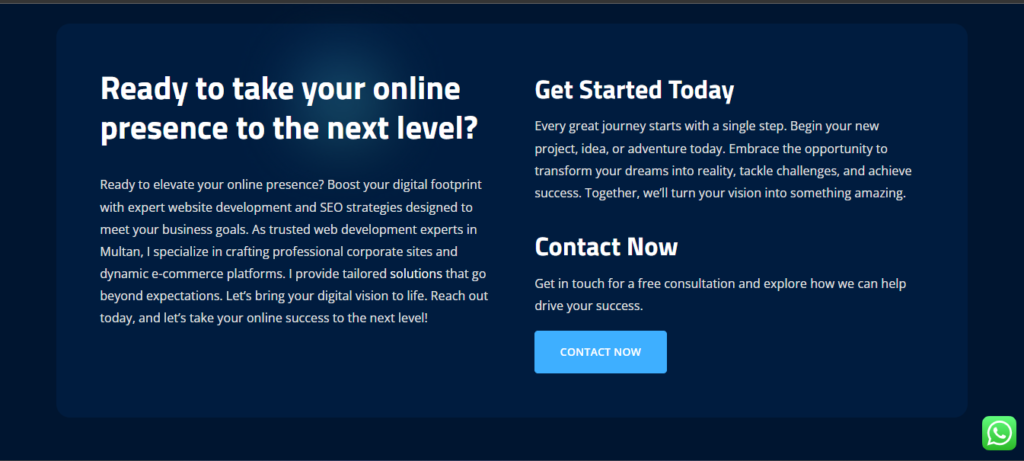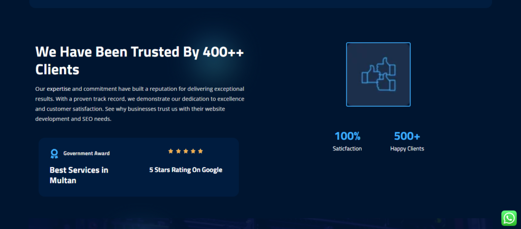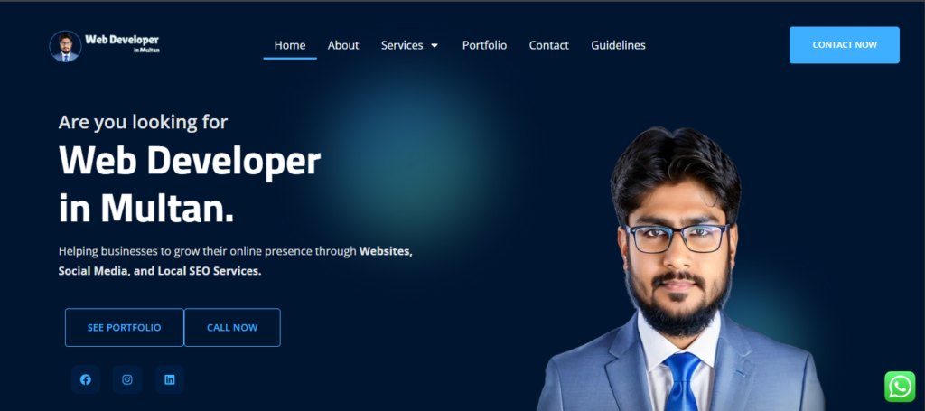 The website is designed to capture local intent searches such as “Web Developer in Multan” and convert visitors into inquiries through clear CTAs, trust signals, and optimized content.